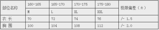 中國衛(wèi)生男、女式針織短袖T恤衫號型按GB/T 1335.1(男子)規(guī)定執(zhí)行。見下表規(guī)定:
